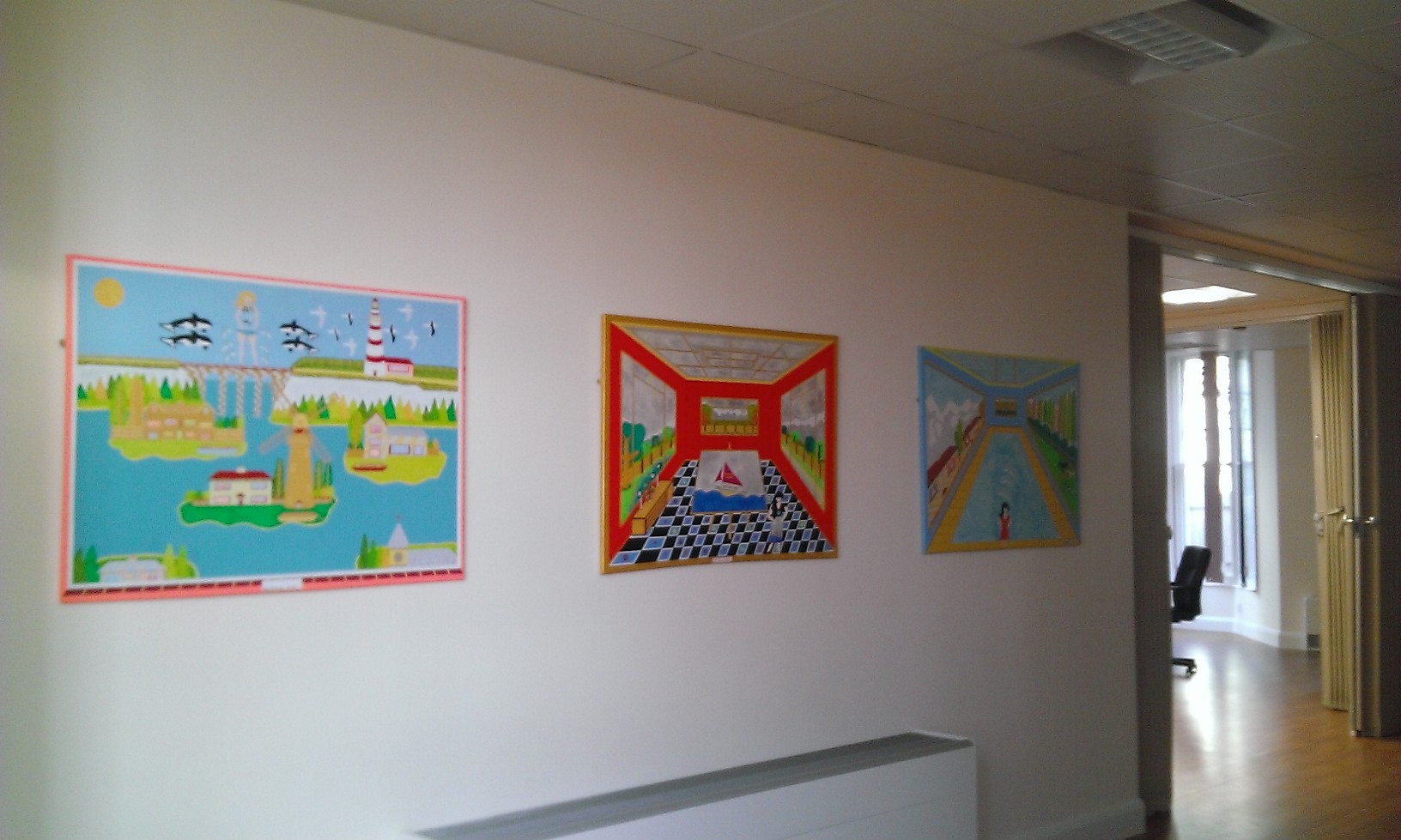 Creative Future, an organisation based in Brighton, aims to promote the work of artists and writers who need extra support through publications, exhibitions and workshops. The organisation also has two milestone events; Tight Modern and the Impact Art Fair, with an in-the-making Literary event on its way. I work part time for the organisation, as their Data and Communications Officer, and have spent the past couple of weeks installing exhibitions at two different venues in Brighton. One of the exhibitions is currently taking place in the corridors of Community Base in Brighton; the home of the Creative Future office. Each mezzanine level has two artworks by Creative Future artists, with pieces ranging from digital prints to acrylic paintings. The second exhibition we have been working on is taking place at The Fed’s new Space for Change, where you can see the colourful, fantastical work of Stephen Humphrey,