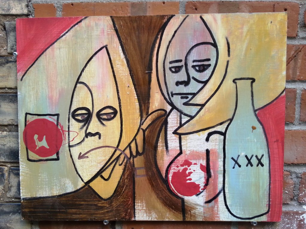 Scott Robinson, a former street artist, grew up skateboarding – “and when I got too old to do that I traded it in for paints,” he says. Scott adds about his progression from skateboarder to artist that “it’s all connected anyhow – skateboarders just look at the world differently. When I see a bench I don’t see a place to see, I see it as an object. The lines in my paintings reflect that.” Don’t Do It was created by Scott after he became sick of the graffiti scene and the threat of incarceration, instead choosing to bring his work to canvas. It is a piece that initially had no meaning, before Scott noticed a pregnant woman and alcohol within the piece. The title came from an intuitive sense of what the image was; a pregnant mother being tempted by the alcoholic drink.