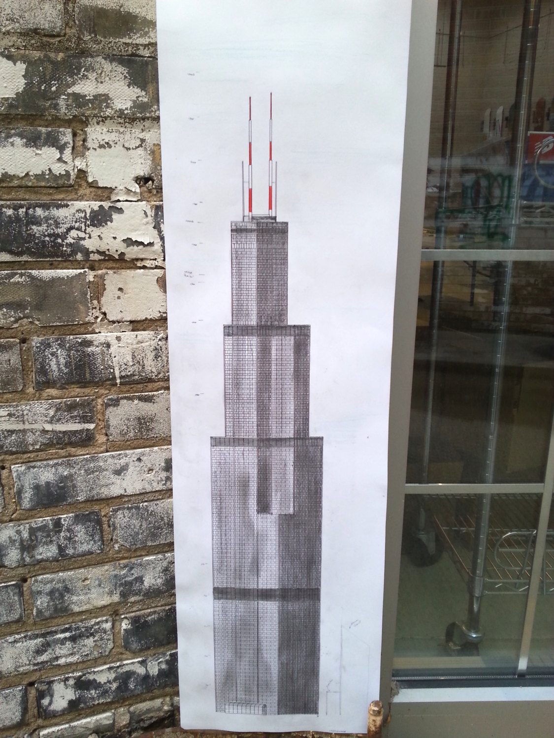 Tom Salazar, one of the Heartside artists, has been interested in art from a young age. His to-scale intricate impression of the Sears Tower is hand-drawn, with not a computer programme in sight. Sears Tower impressively has every window and is draw foot for foot completely to a smaller scale. Tom also makes miniatures of some of his designs, and takes inspiration from architecture, cars and landscapes, as well as building his own furniture when needed.
