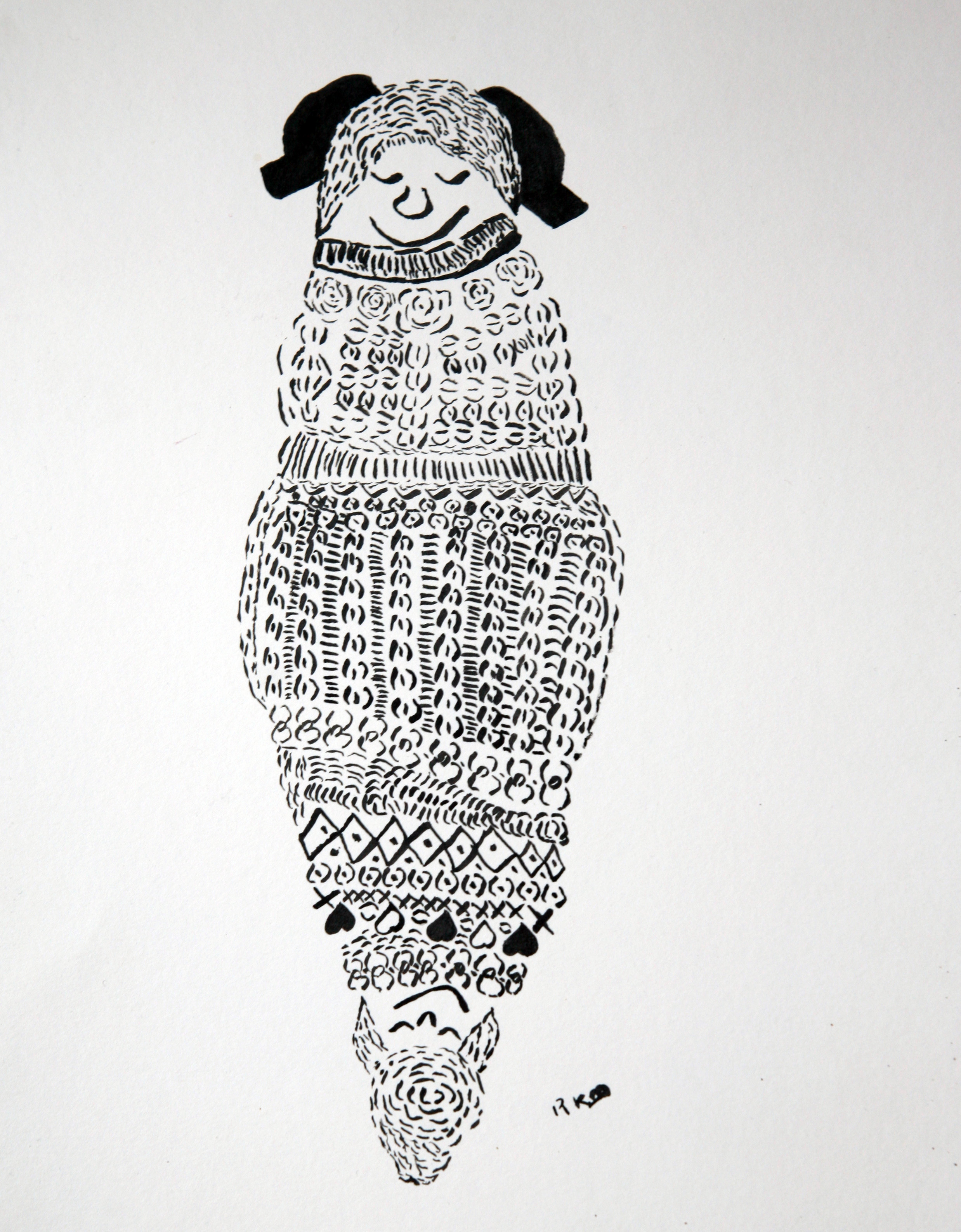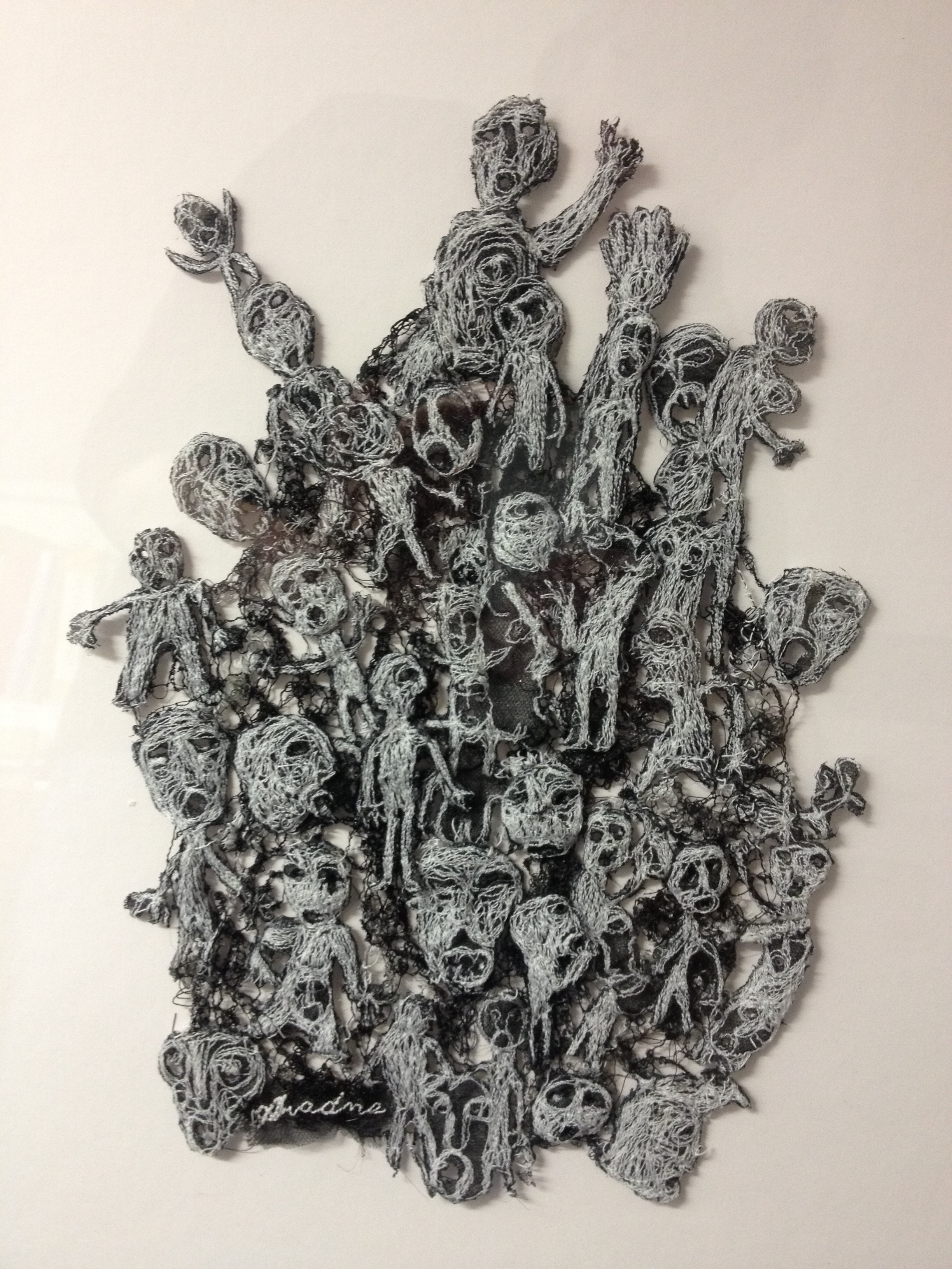 Both Valerie Potter and Aradne use embroidery techniques to, in the case of Aradne, create figures, birds, insects, flowers and text, which all come together in her web-like structures, and in the case of Potter, keep herself sane.