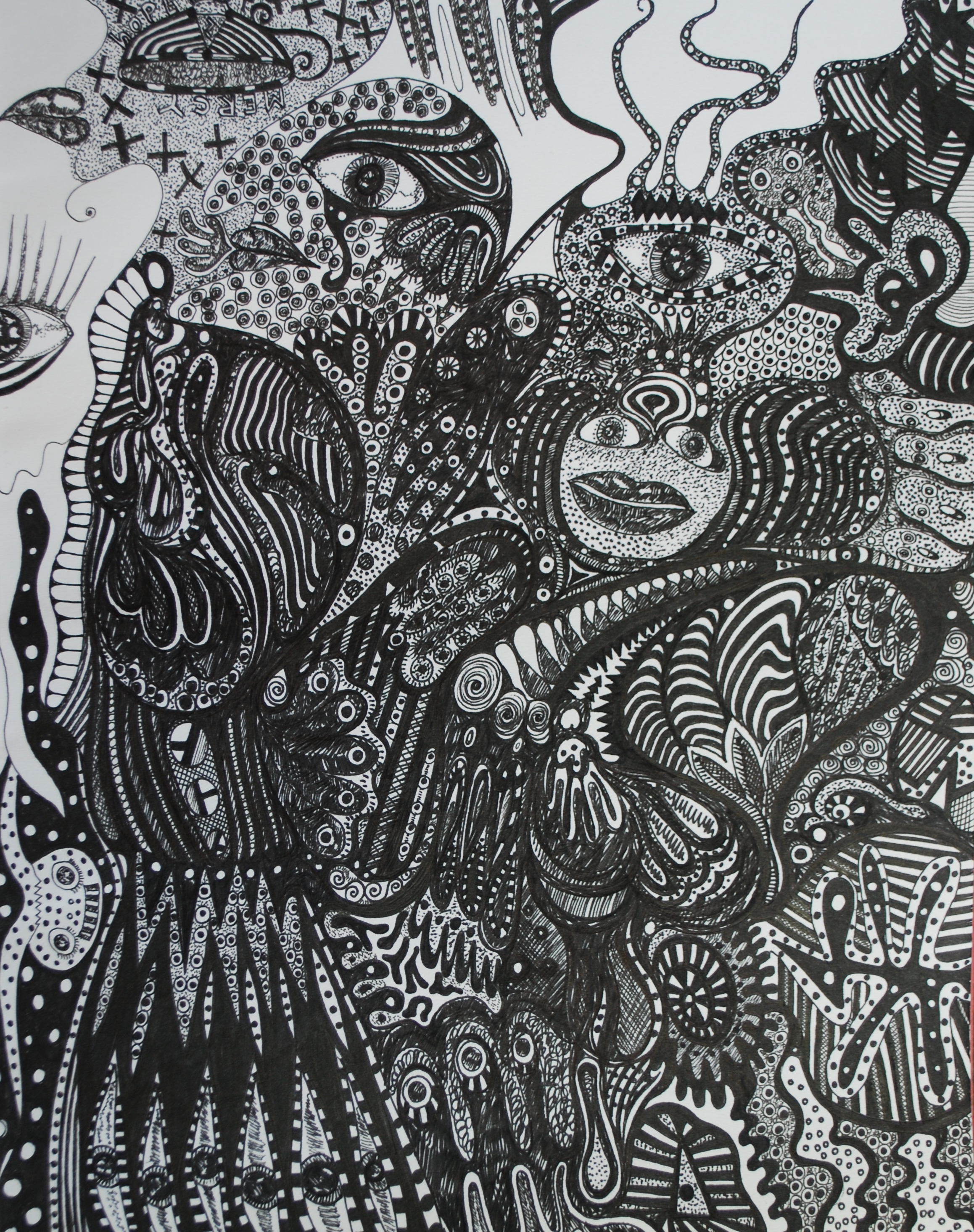 The artists in the exhibition create for numerous different reasons, one of the most common being as a release or a way of finding balance. Albert’s pen and pencil drawings of imagined buildings act as a form of meditation for the artist, a release from the boredom and tedium of hospital life, whilst Chris Neate’s automatic ink doodles help him maintain a calm stability. Albert says of his work: “I start with a vision in my mind and it blossoms from there … I imagine the building being constructed in brick and brought to life.”