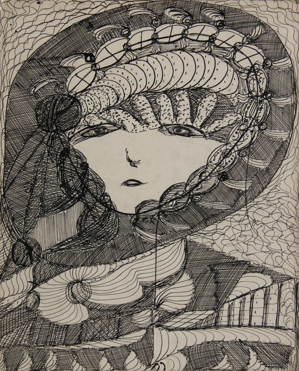 Working mainly on paper, card and textiles, Gill used pen to create maze-like surfaces with a glittering, almost hallucinatory quality that often reveal a female face. Ranging from postcard size to over 10 metres long, her work immerses the eye in a dark world of mystery, beauty and obsession. Her work has been included in previous Orleans House Gallery Outsider and Visionary art exhibitions, the Tate Gallery, and more recently at the Whitechapel Art Gallery , Museum of Everything and Nunnery Gallery.