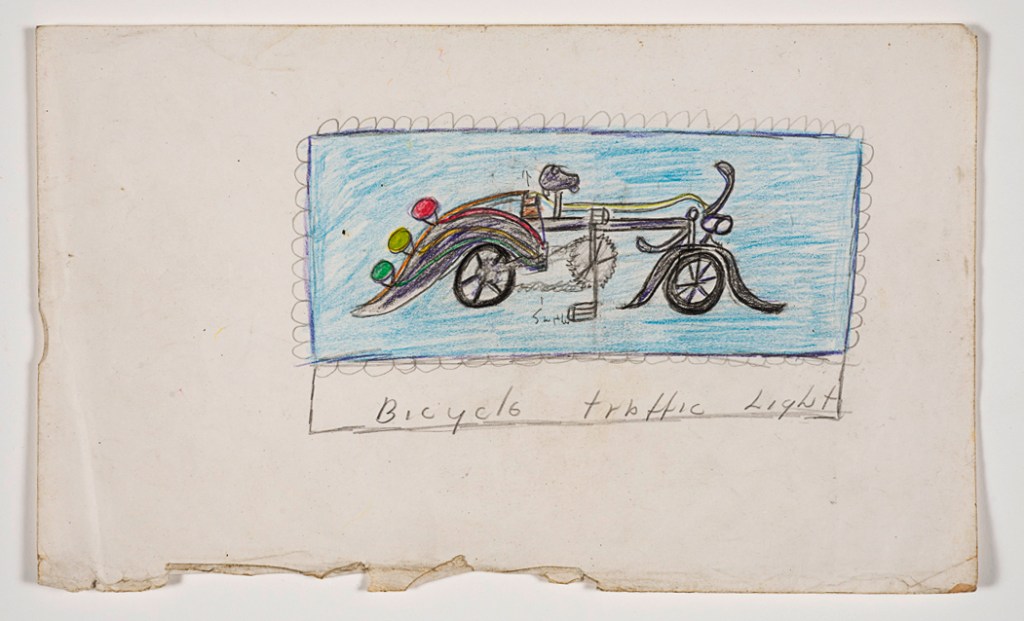I doubt if Fairley was a cyclist at the time I knew him, but he would have seen people biking everyday on the streets of the Lower East Side. And he would certainly have seen, as I did, bike messengers speeding deftly and sometimes dangerously through Manhattan traffic. Perhaps close encounters between cars and bikes were the inspiration for Fairley’s ‘Bicycle traffic Light’ invention (Image 37). It looks like it is designed to alert people behind the bike as to whether the cyclist is speeding up, slowing down or stopping.