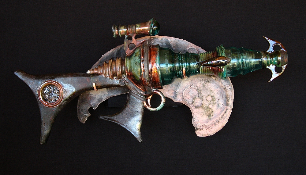 I’ve been making the ray guns now for 20 years, continually exploring design variations and playing with the juxtaposition of multiple materials, such as incorporating found glass parts and led lights into the sculptures. As a long-time fan of Science Fiction as a literature of ideas, these sculptures have become my homage to classic science fiction authors and the culture of human striving, powered by imagination, that they explored.