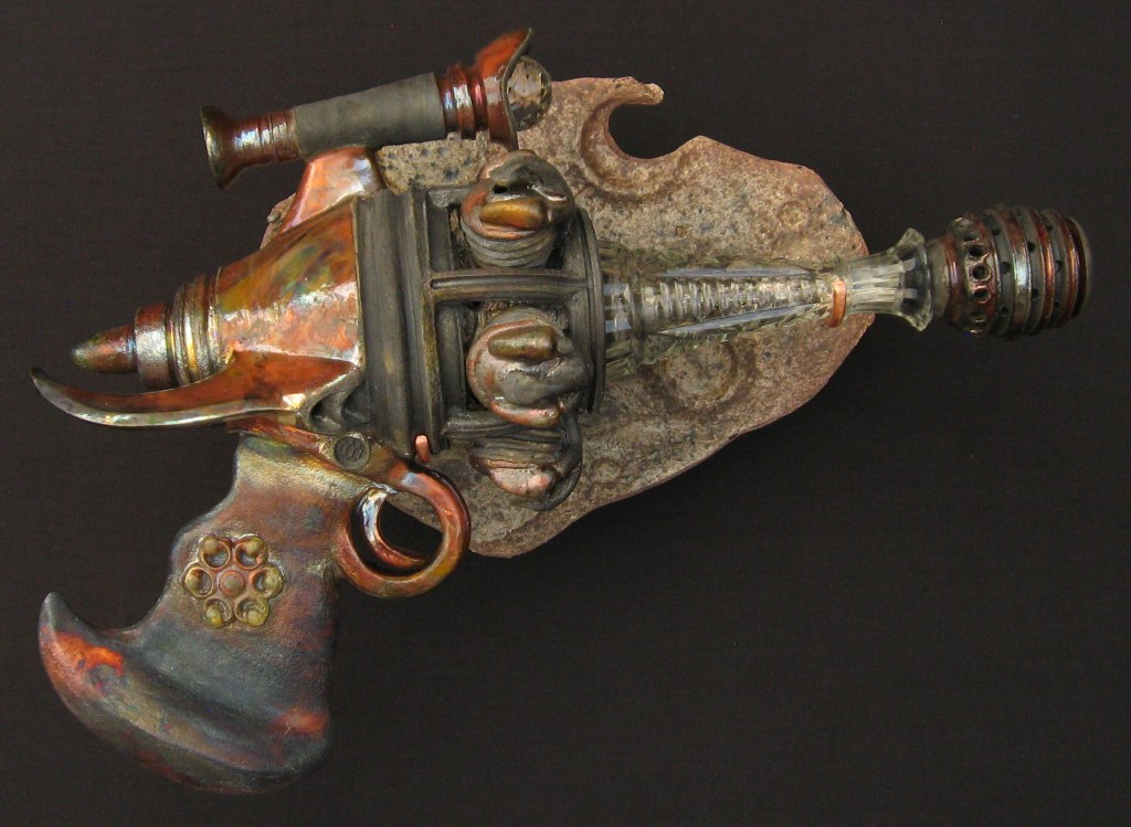 After spending over two decades working as a photographer, silk-screener and graphic artist, I learned to throw on the potter’s wheel and returned, at long last, to creating three-dimensional artwork. Some of the first pots I made were raku-fired bottles and vases. When I laid one of the bottles on its side I realized that my own subconscious, unbeknownst to me, had been busy creating ray gun barrels. I had been drawing on images stored during childhood, of the illustrations from pulp science fiction magazines and book covers, as well as 50’s automobile design and designs from Victorian Super-Science.