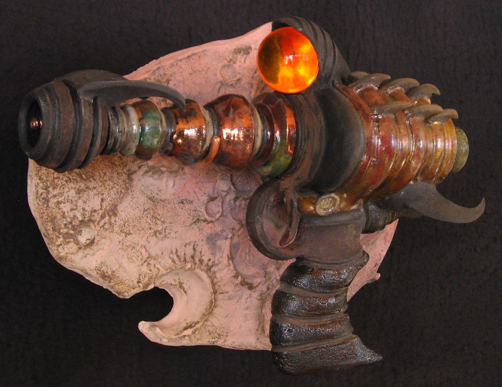 I immediately made the rest of the components for my first ray gun, throwing them separately on the wheel and then manipulating them and joining the leather-hard clay parts carefully together. They were then glazed and fired using the raku firing technique. During this process the pieces are removed from the kiln at the peak of glaze-melt, the glazes glowing like fire on ice. Once placed in a barrel full of combustible material, the glazes undergo a chemical change, and cool rapidly, producing iridescent colors, metallic effects and a distressed look that gives them the feel of alien artifacts long-buried.