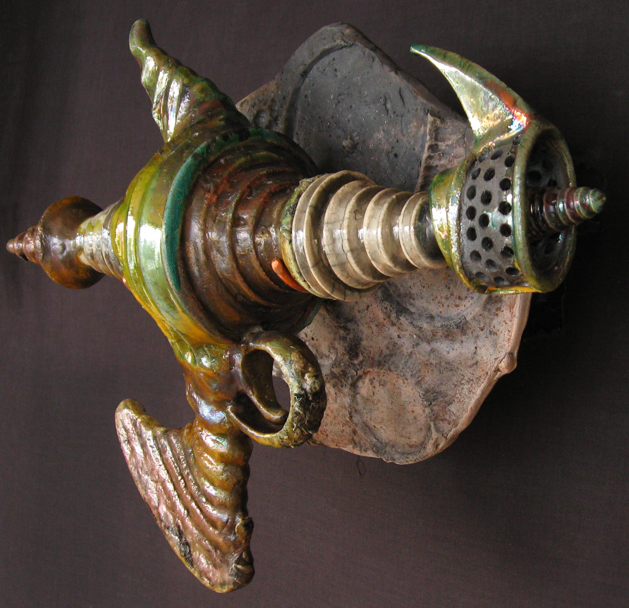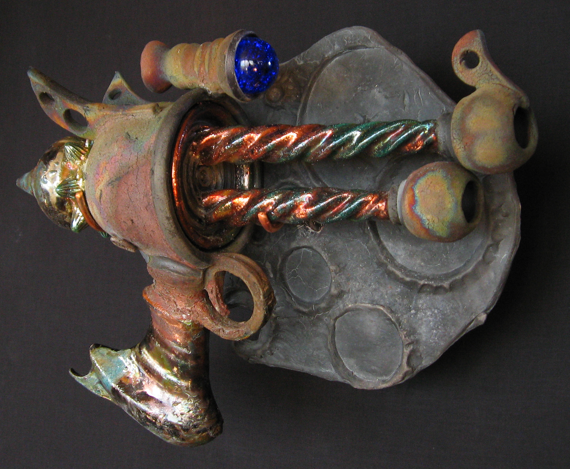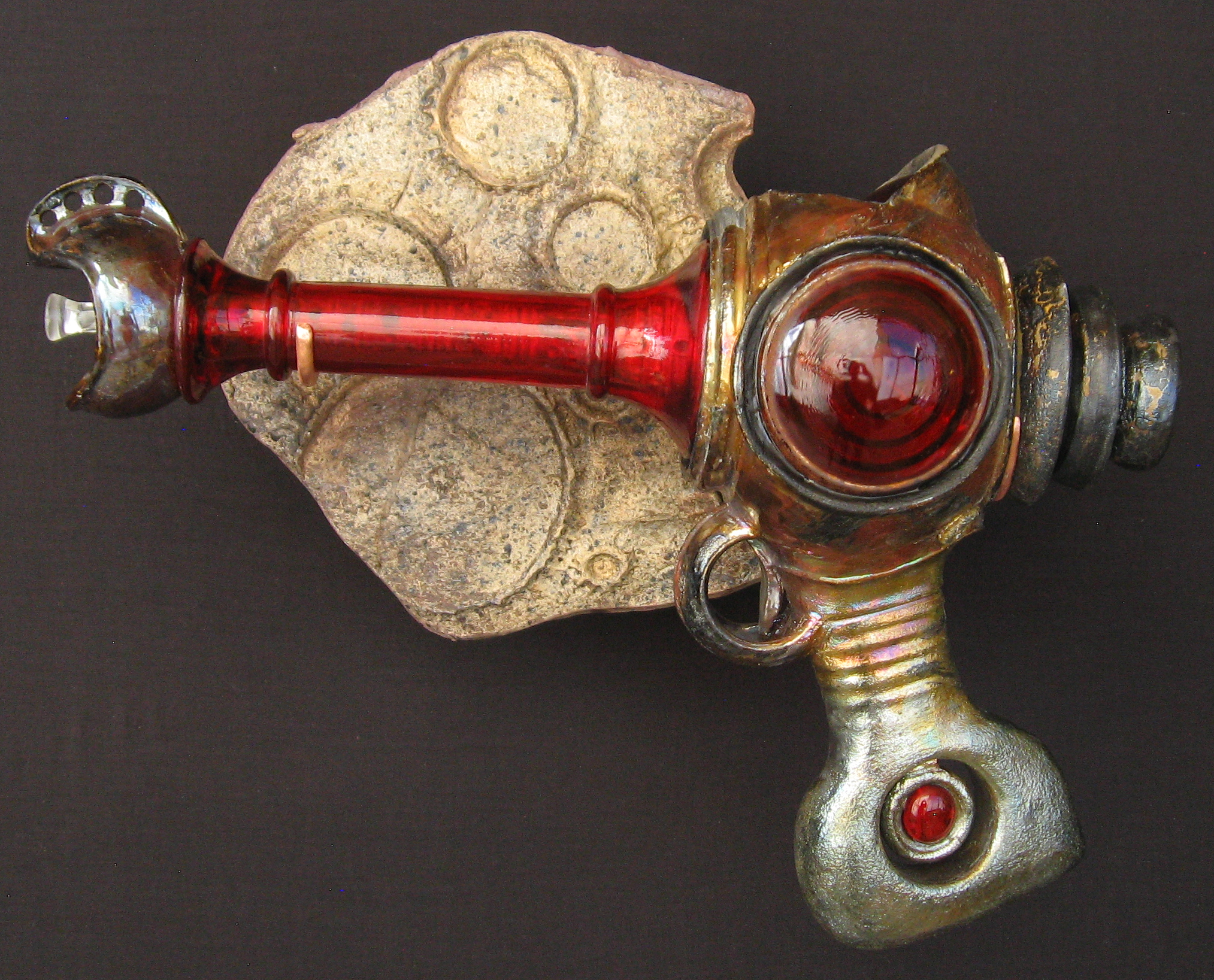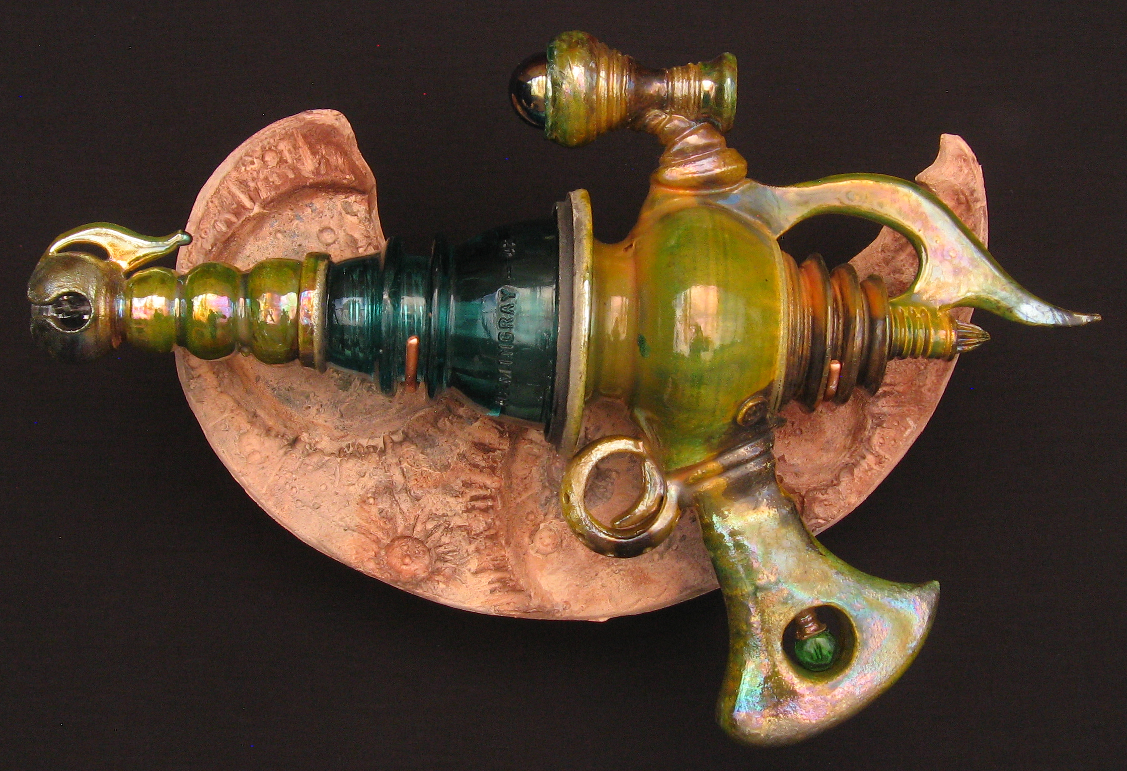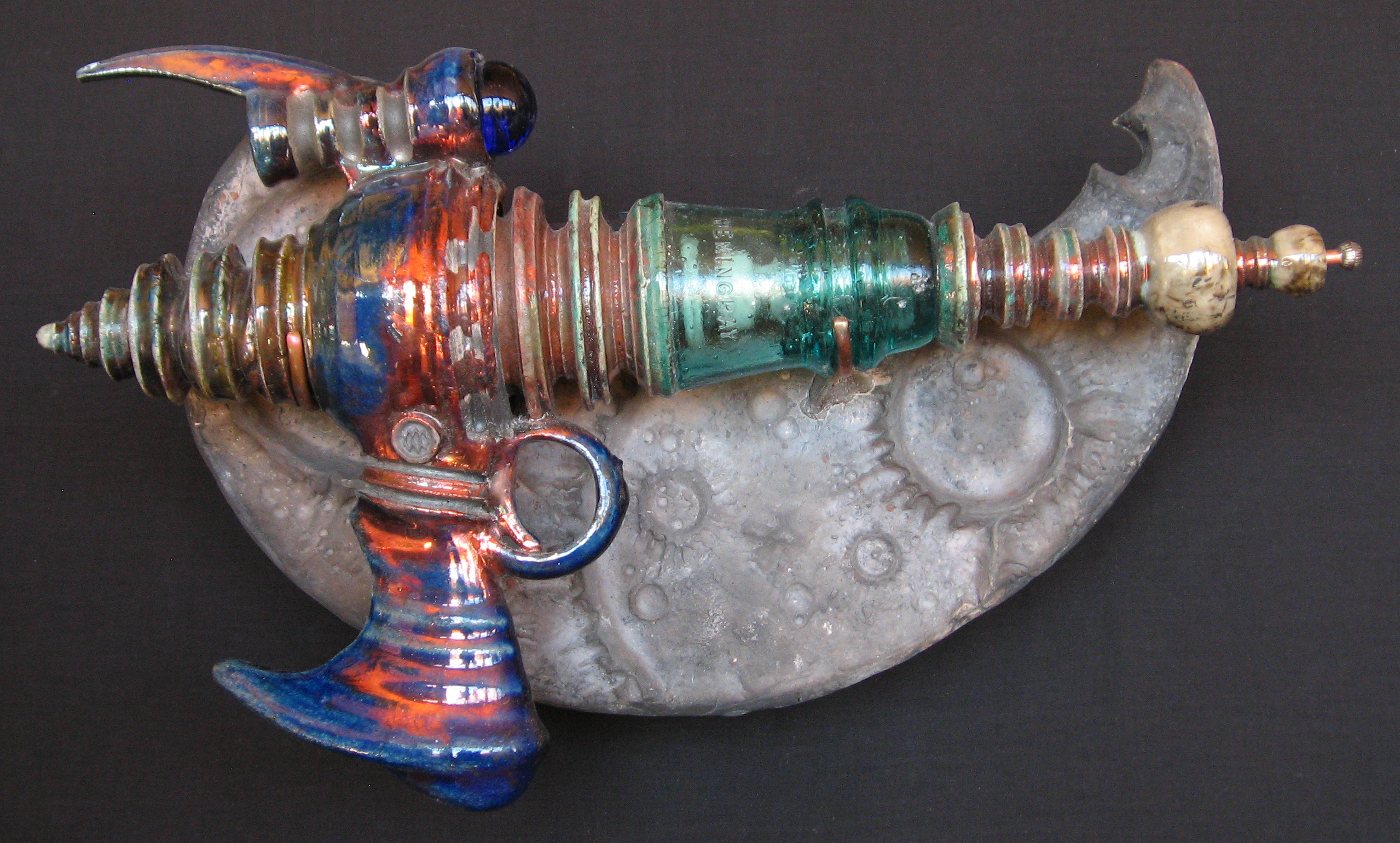 After spending over two decades working as a photographer, silk-screener and graphic artist, I learned to throw on the potter’s wheel and returned, at long last, to creating three-dimensional artwork. Some of the first pots I made were raku-fired bottles and vases. When I laid one of the bottles on its side I realized that my own subconscious, unbeknownst to me, had been busy creating ray gun barrels. I had been drawing on images stored during childhood, of the illustrations from pulp science fiction magazines and book covers, as well as 50’s automobile design and designs from Victorian Super-Science.
