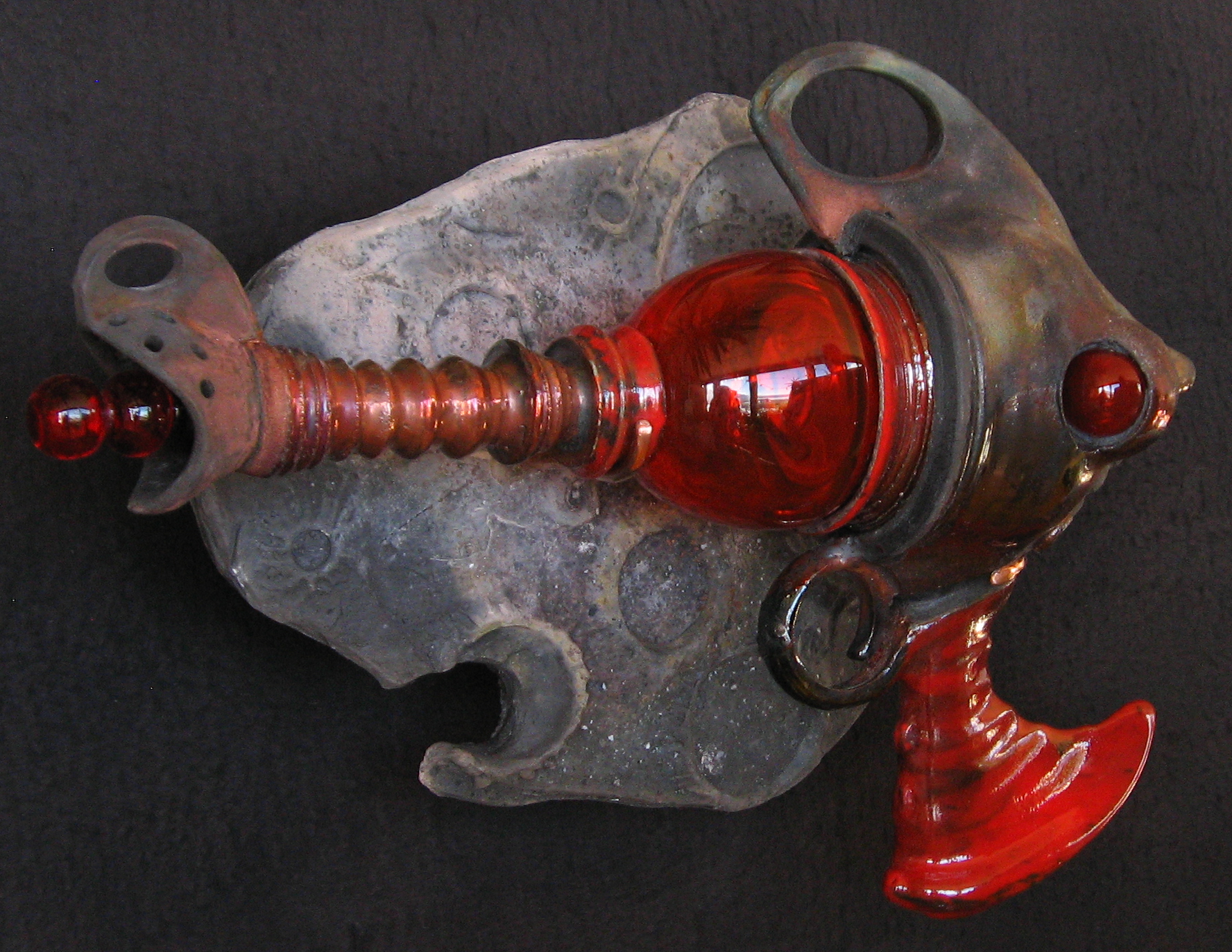 I’ve been making the ray guns now for 20 years, continually exploring design variations and playing with the juxtaposition of multiple materials, such as incorporating found glass parts and led lights into the sculptures. As a long-time fan of Science Fiction as a literature of ideas, these sculptures have become my homage to classic science fiction authors and the culture of human striving, powered by imagination, that they explored.