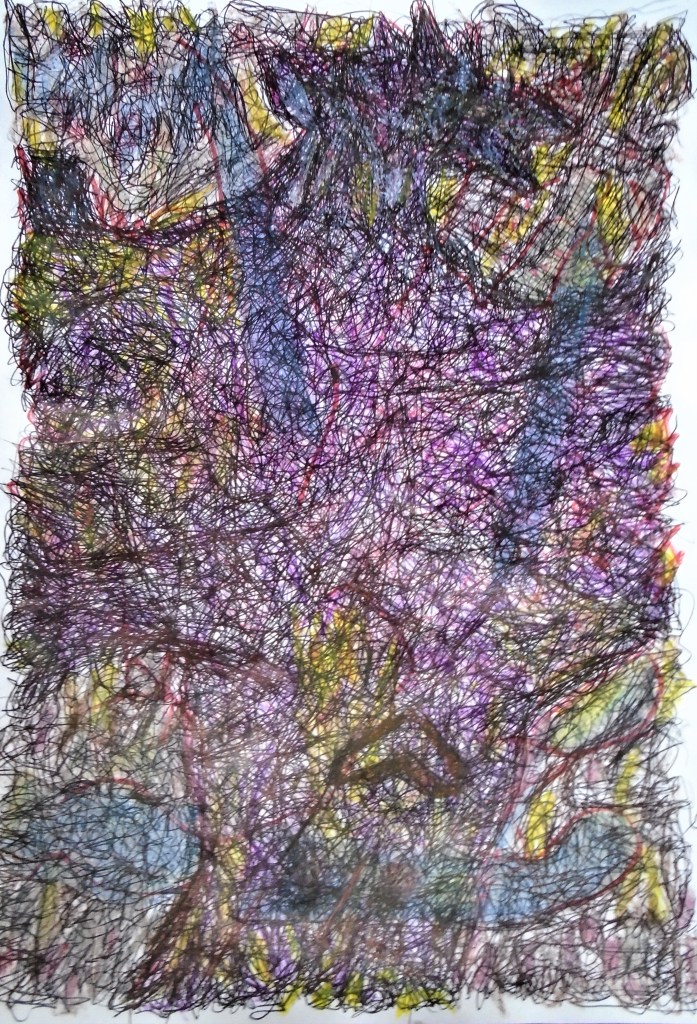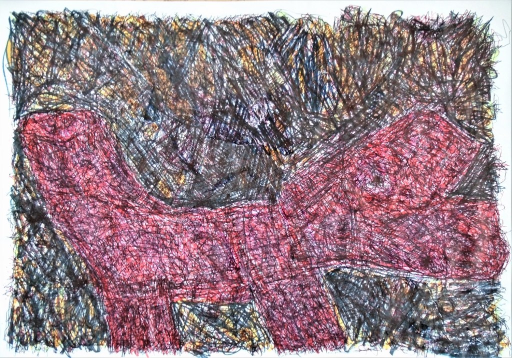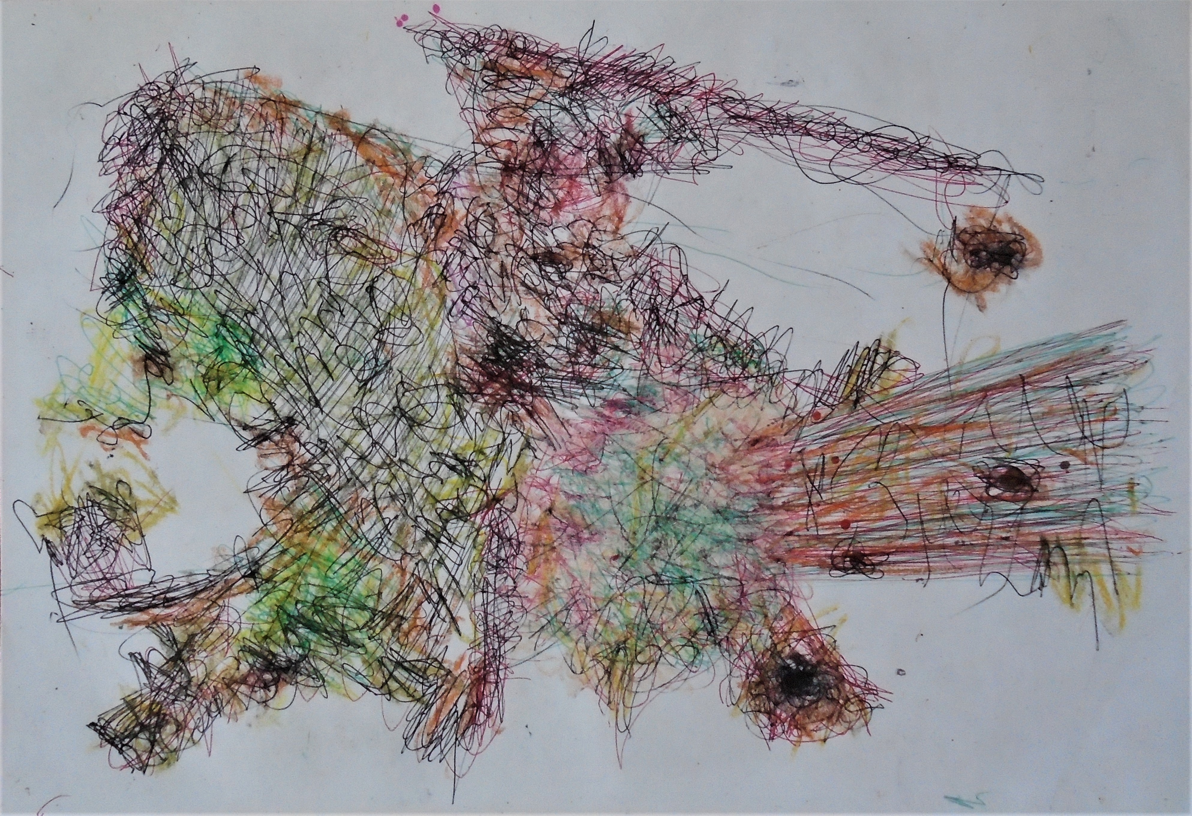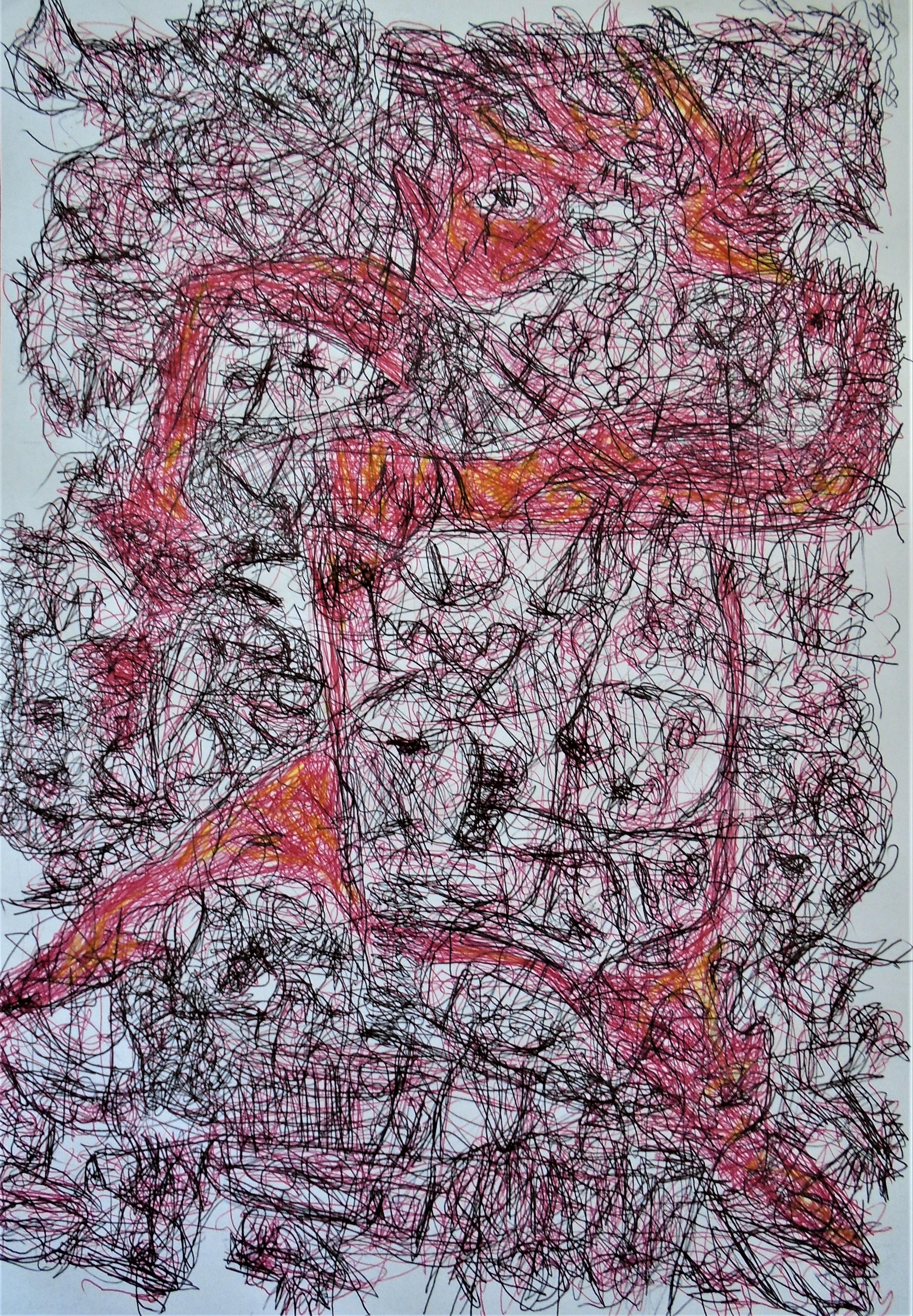 I remember being in the classroom, drawing in a notebook and listening to the teacher a little. Later on, high school art lessons were the best hours of my week. When I start my work I have no plan. It will be an ongoing development, which will be structured in a kind of anarchic way until it is complete. I work instantaneously without filters. The work will sometimes be modified or completely revisited days, weeks, months later. I am inspired by the artworks of several artists like Cy Twombly, Basquiat and Jean Dubuffet. I hope viewers of my work will be surprised – maybe they will enjoy it – I just hope for a positive feeling that’s all. Outside is good for me: fresh air, freedom, space, movement.
