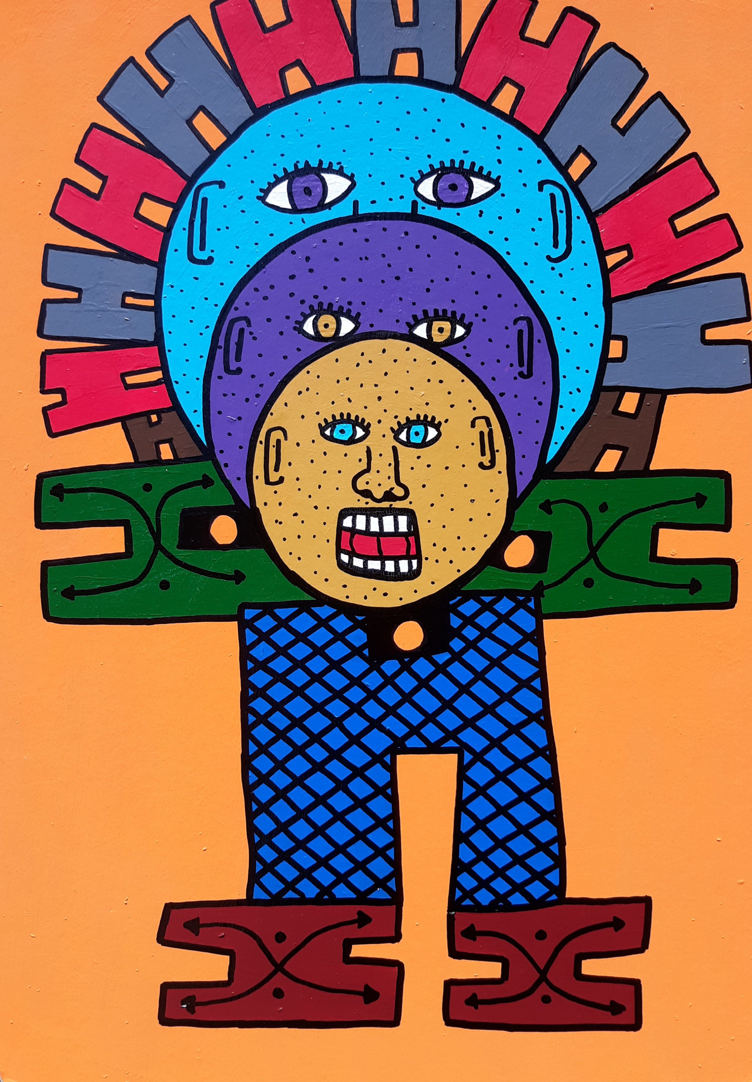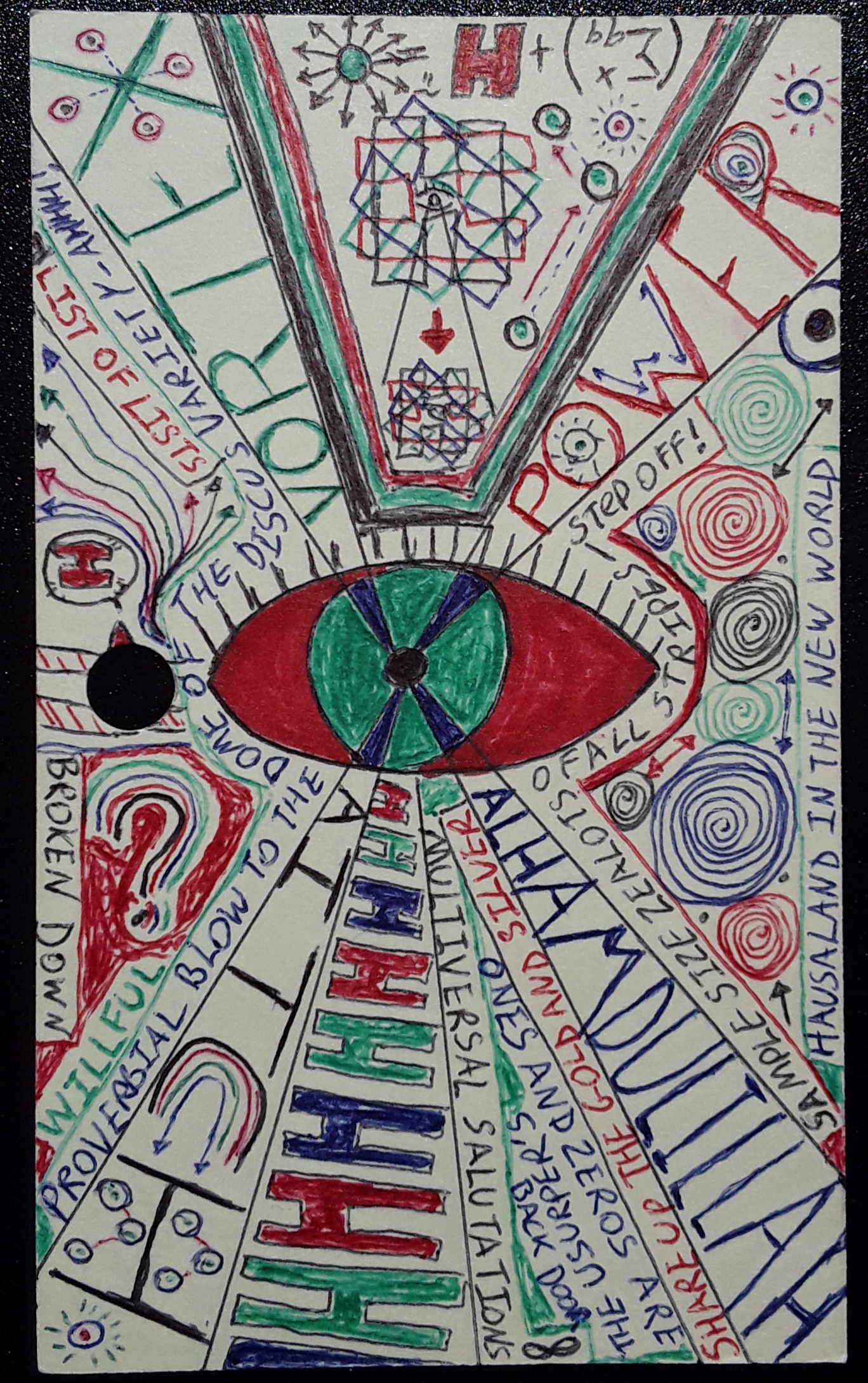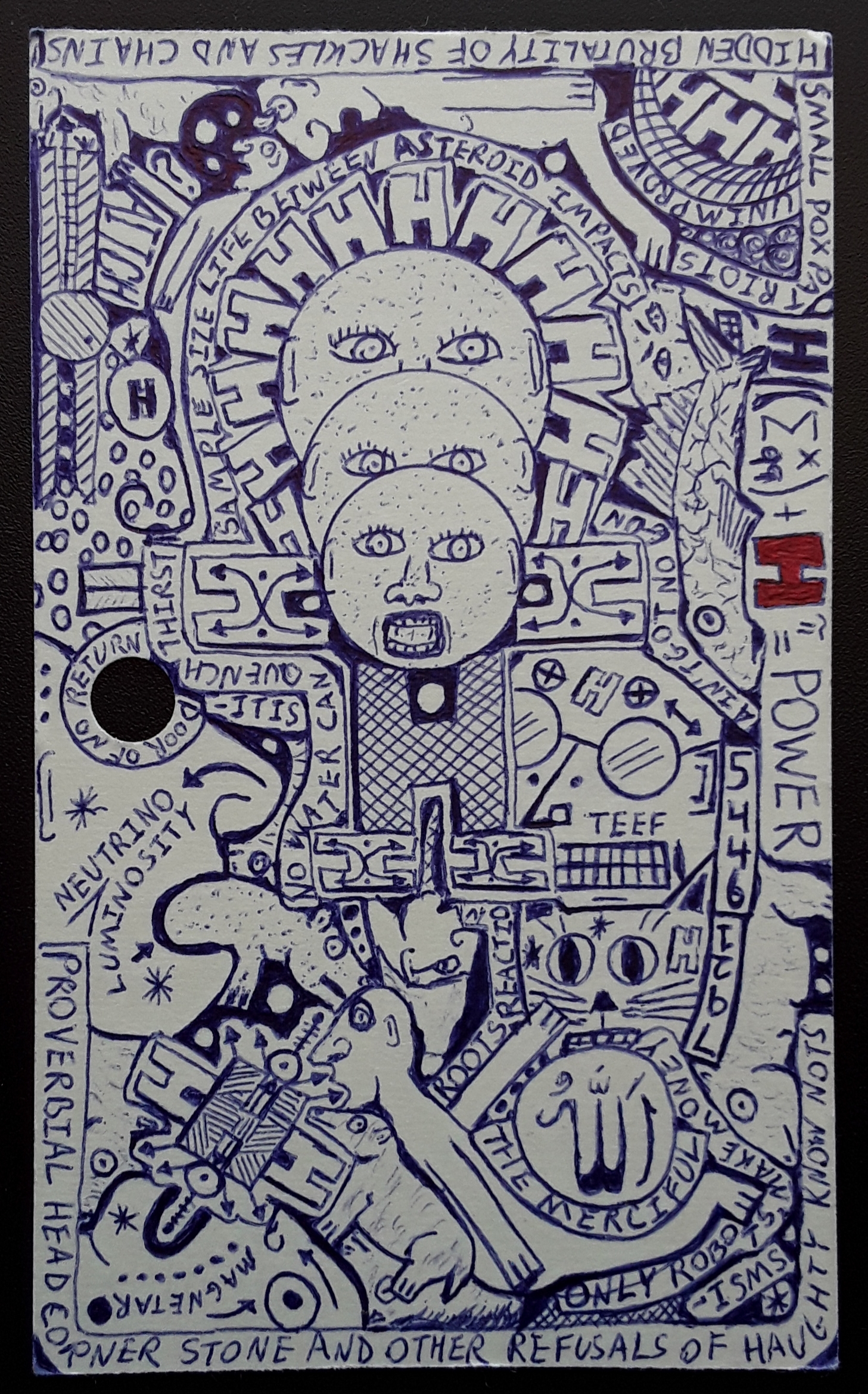 I’m convinced there are people out there who will get what I’m attempting to do and see the logic. I hope to connect with these people. It’s taken over five years to make nearly 2,000 renderings from the Aitchverse and I’m ready to talk to people about the ideas. Also, looking closely at my Mind Tic Storms, small (3×5 inch) detailed renderings, can be exhausting, even for me. After looking at four or five, you kind of need a rest. Your eye doesn’t quite know where to look, you’re squinting, the images and words are coming at you from all directions–upside down, sideways, twisting, intertwining. You’re left blurry eyed, brain in a fog, excited and confused at the same time, almost hypnotized. That’s a glimpse into how I often feel at the end of a day of having to process the constant flow of random thoughts and compulsions, intrusive and otherwise, that pop into my tic mind.