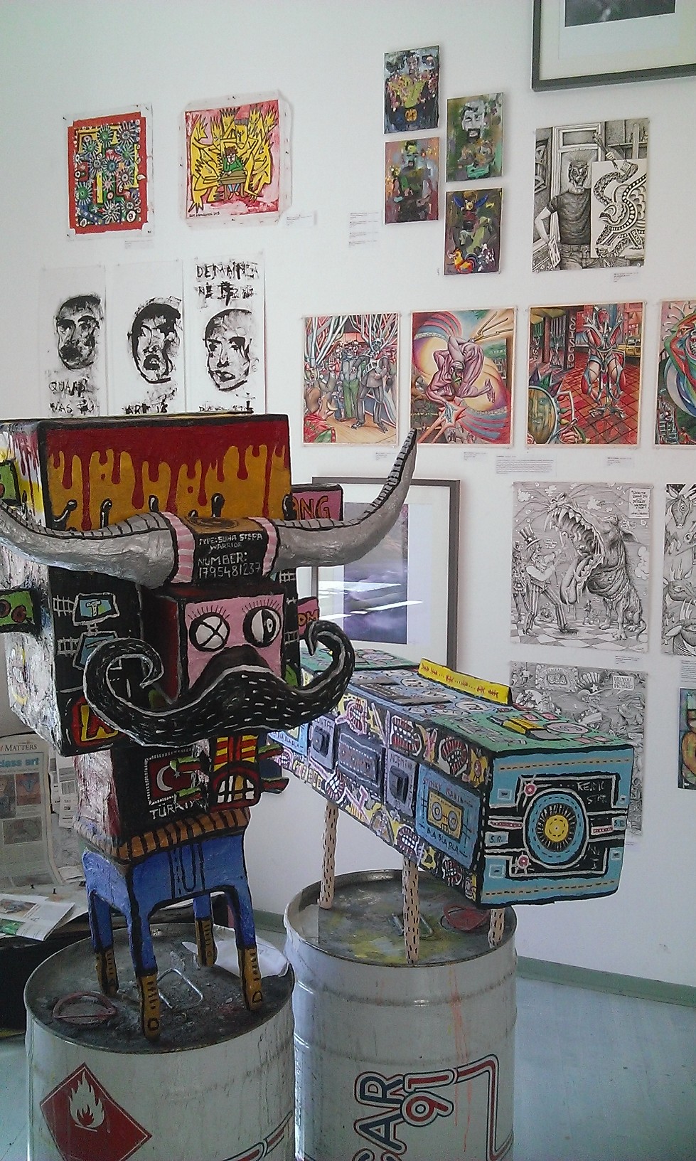 Some of the highlights of the Piran show were works by Carlo Keshishian, Dan Casado and the graphic works of Jim Meehan; about whom Nok shared an interesting story during my visit. Jim was discovered in Pennsylvania during Circus Terminal USA in 2013. Chris and Paul Czainski (two UK artists) had been offered a residency at Clay on Main in Pennsylvania near Boyertown where Circus Terminal was being held. They came across Jim at a community event they ran, after which he invited them to his house. The next day, the artists told Nok that Jim’s house was covered in thousands of works that had rarely been seen by anyone – let alone exhibited anywhere. Jim then visited Circus Terminal and has been involved with the project ever since.