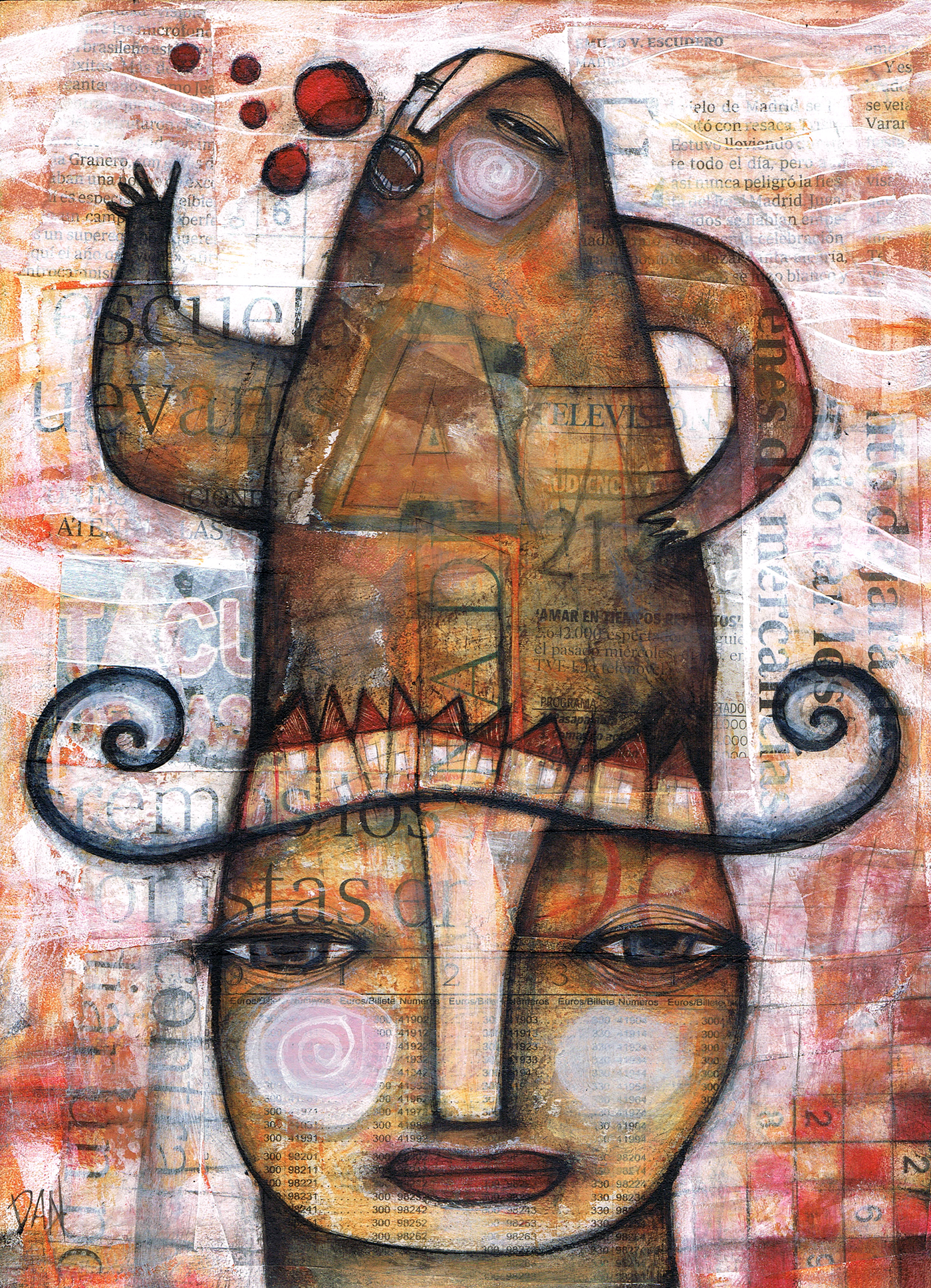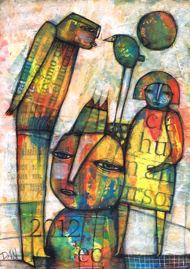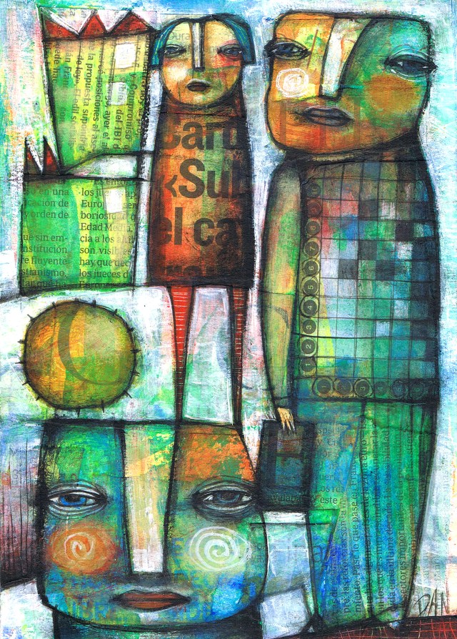 “I make art because that is the only way life makes sense to me. A recurrent theme in my work is the face: semi-abstract, colorful and emotional. I don’t choose to draw these faces. Their forms just come to me. They jump off the page and stare at you. Dare to stare back. I have tried to choose between media. I cannot. I feel fully engaged and alive when I’m creating. I’m a maker of images more than a storyteller. My work is about being a woman and an outsider. It has been described as playful, haunting, bold, whimsical, colorist, sad, poetic, mysterious and tense.” – Donna Kuhn.